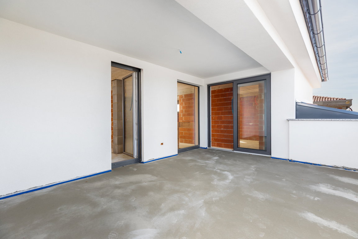V nadstropju se nahaja odprta galerija, ki vodi do dveh otroških sob, prostorne spalnice z lastno garderobno sobo, dveh kopalnic ter delno pokritega balkona, kjer si lahko uredite kotiček za sprostitev s pogledom na naravo.