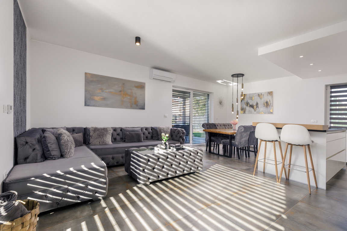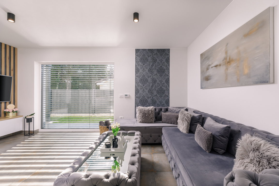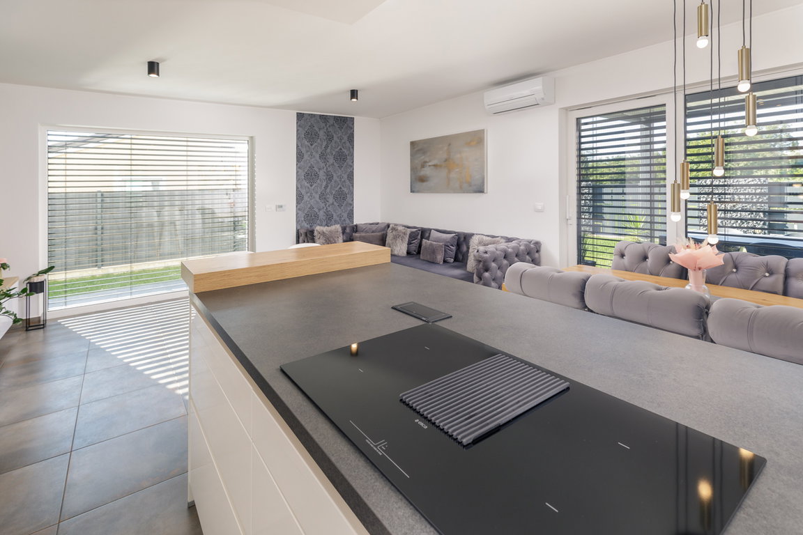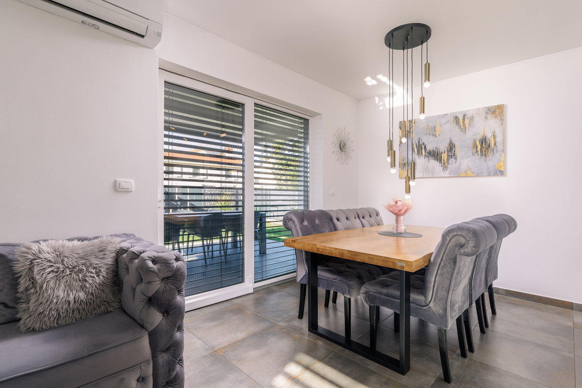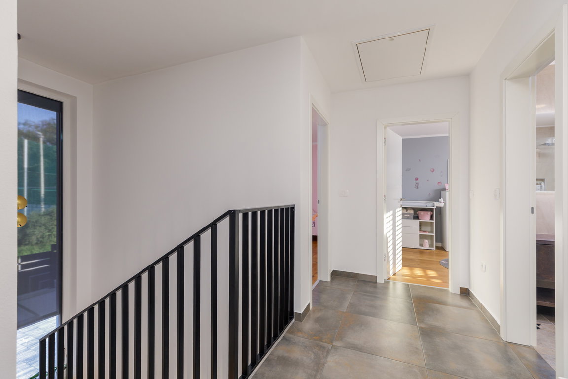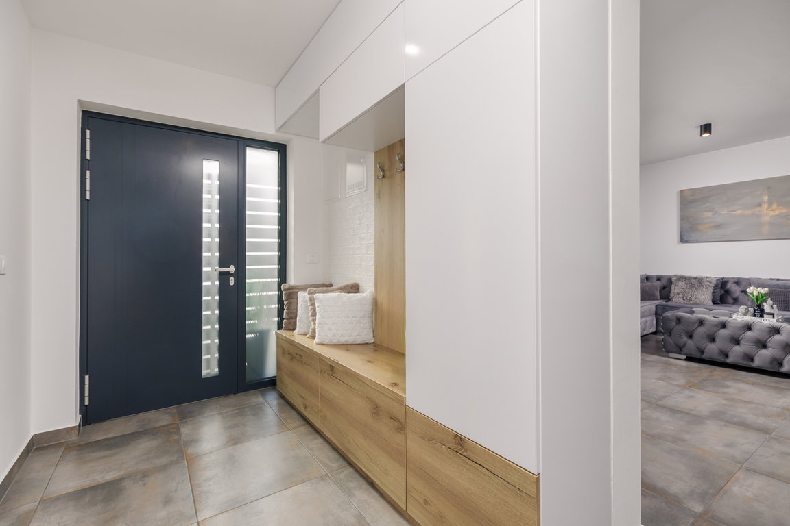 Opremljena z vrhunskim stavbnim pohištvom, vključno s troslojnimi okni ALUKS v elegantni antracit barvi na zunanji strani in beli na notranji strani. Vgrajene so avtomatske žaluzije na vseh oknih, panoramsko troslojno okno na hodniku pa je opremljeno z električnim rolojem z delno zatemnitvijo in visoko odpornostjo na burjo. Tudi vhodna vrata so izdelave ALUKS, kar dodatno poudarja kakovost in varnost objekta.