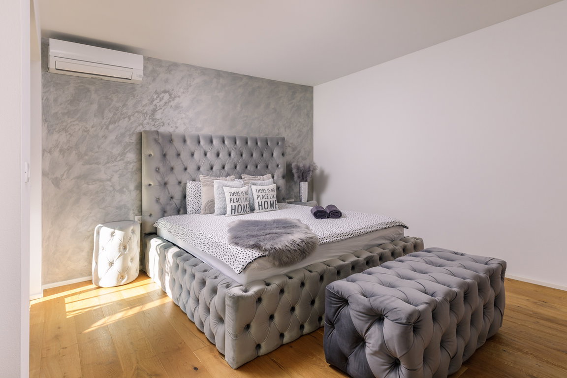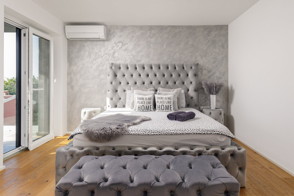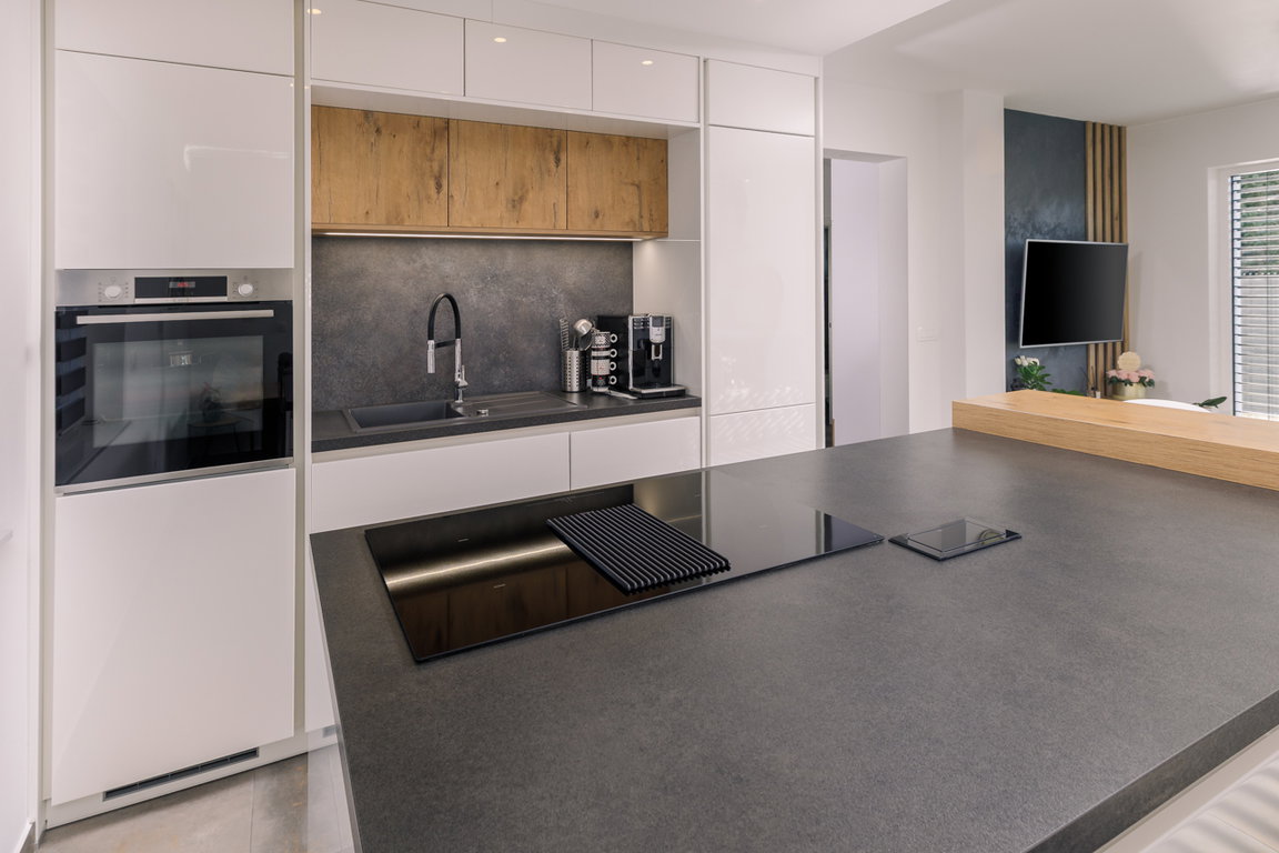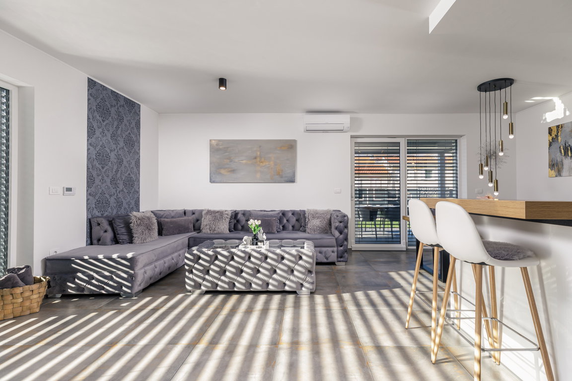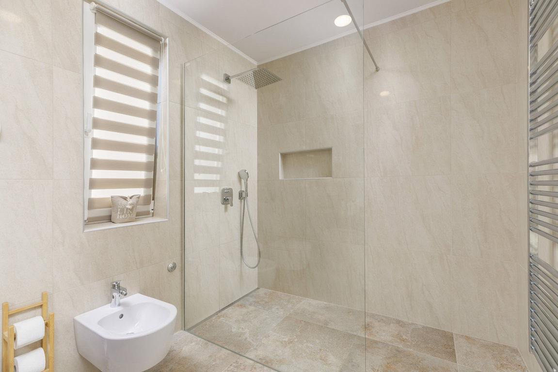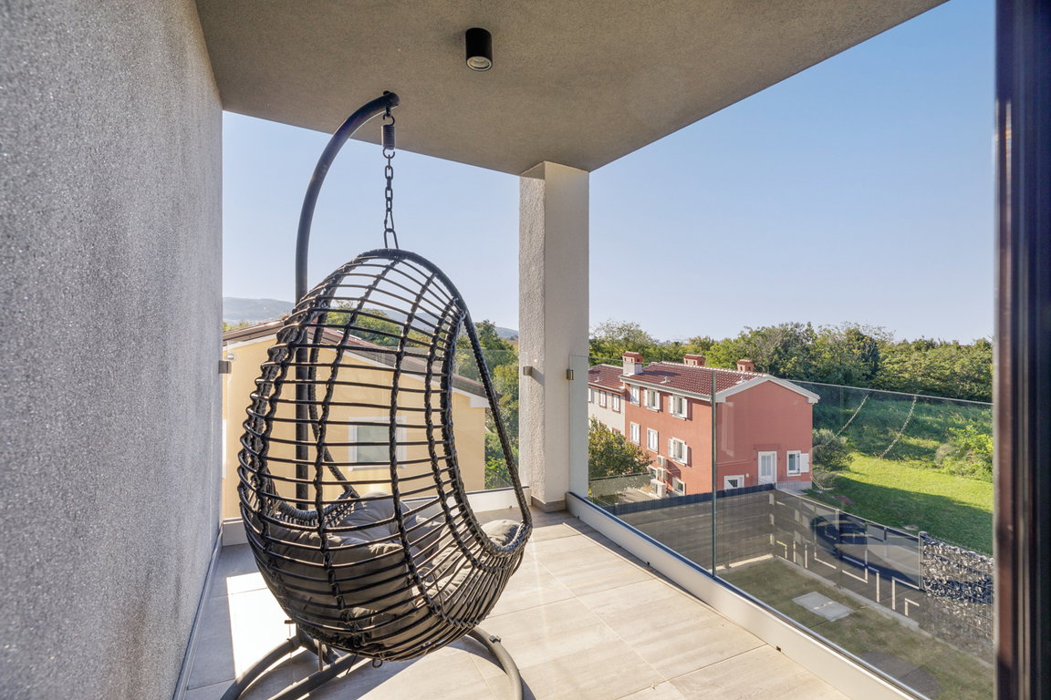 Opremljena z vrhunskim stavbnim pohištvom, vključno s troslojnimi okni ALUKS v elegantni antracit barvi na zunanji strani in beli na notranji strani. Vgrajene so avtomatske žaluzije na vseh oknih, panoramsko troslojno okno na hodniku pa je opremljeno z električnim rolojem z delno zatemnitvijo in visoko odpornostjo na burjo. Tudi vhodna vrata so izdelave ALUKS, kar dodatno poudarja kakovost in varnost objekta.