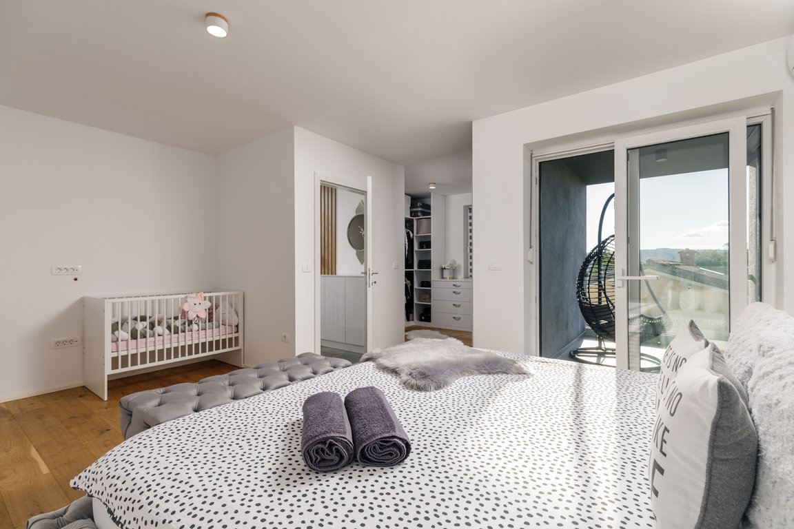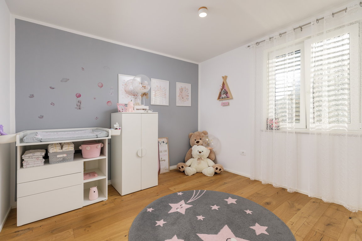 V pritličju se nahajajo prostorni in svetli bivalni prostori, ki vključujejo predprostor, ločen WC, utility, stopnišče ter sodobno kuhinjo, povezano z jedilnico in dnevnim prostorom. Velike steklene površine vam omogočajo obilico naravne svetlobe in neposreden izhod na teraso, ki je idealna za sproščanje in druženje. V nadstropju je spalni del, zasnovan kot mirna in intimna cona, kjer se nahaja glavna spalnica z garderobno sobo in balkonom, dve otroški sobi ter prostorna kopalnica.