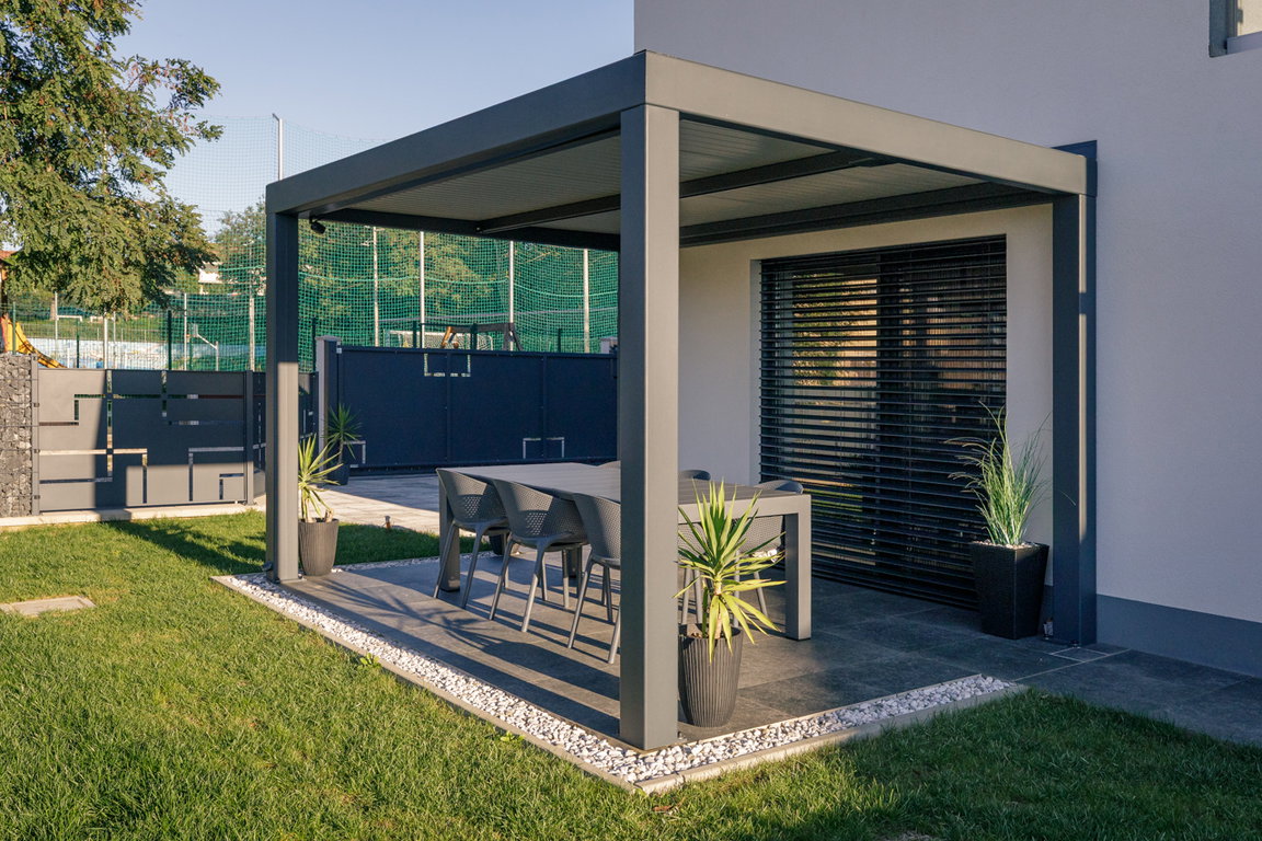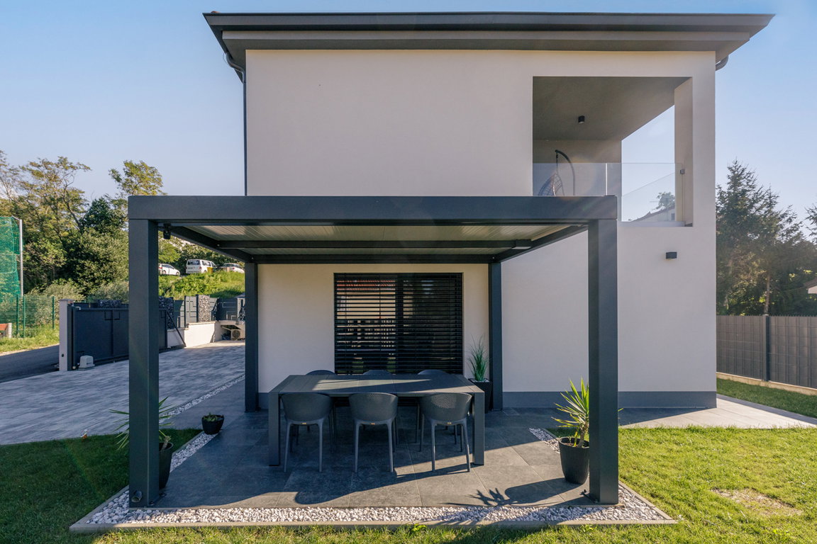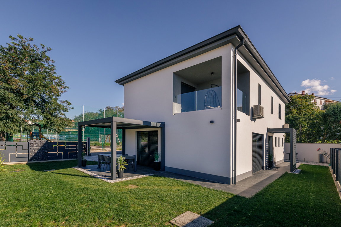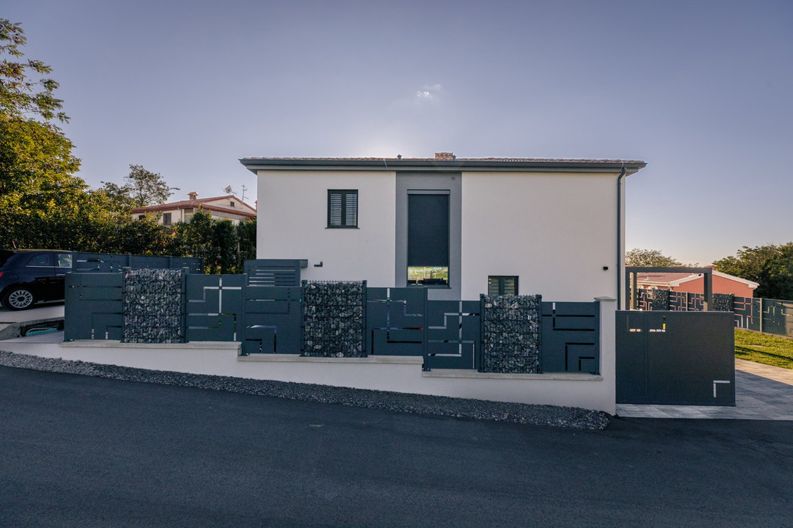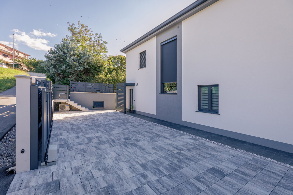 Zunanjost hiše je enako skrbno urejena kot notranjost. Dostop na parcelo omogoča avtomatski drsni porton z unikatnim vzorcem, ograja iz perforirane pločevine z dodatkom črnega kamna pa ustvarja moderen in hkrati eleganten videz. Okolica je v celoti urejena z zelenico in estetskimi tlakovci, parkiranje pa je zagotovljeno za tri vozila.