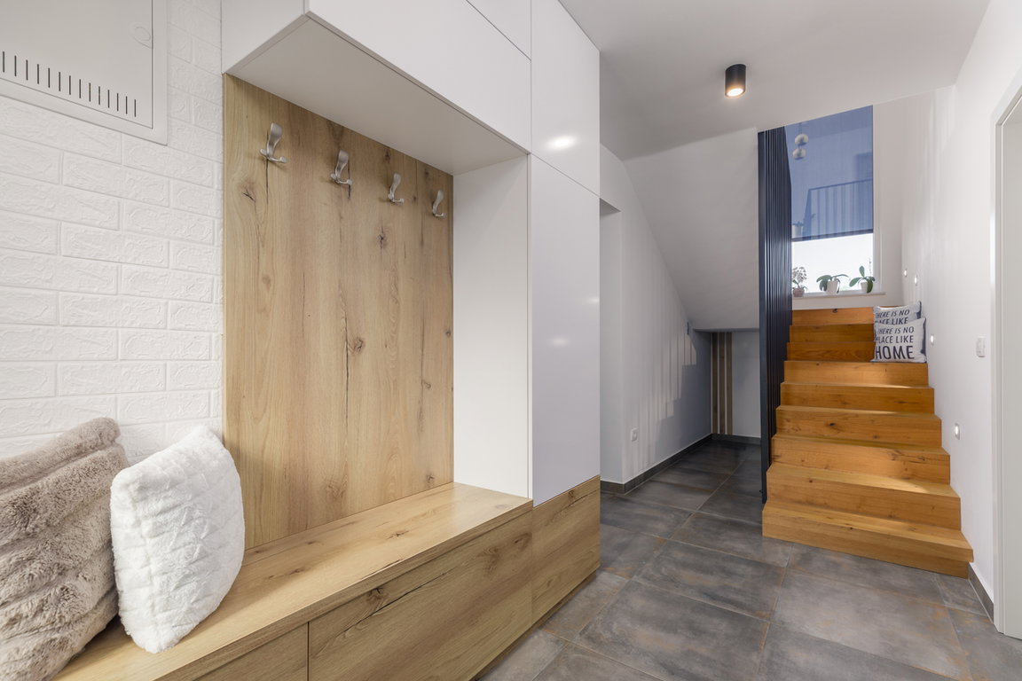 Notranjost hiše zaznamujejo skrbno izbrani materiali in pohištvo po meri. V pritličju je položena vrhunska keramika Evolution, stopnice in spalni prostori pa so obdelani z rustikalnim parketom, ki je grobo krtačen in mat oljen. Kopalnice so opremljene z opremo priznanih blagovnih znamk Hansgrohe in Villeroy & Boch, vsa vgradna oprema, garderobne rešitve in kopalniško pohištvo pa so izdelani po meri s strani izkušenega mizarja. Tekstilno pohištvo proizvajalca Furniture Modern dopolnjuje celoten ambient z občutkom sodobnega udobja.